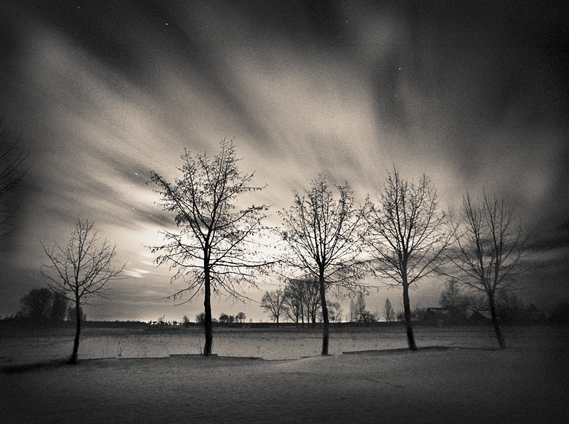 17/ Apšvietimas nuo tolimo (apie 15km) miesto šviesų, šiek tiek vėjo (kažkur aukštai, nes medžių šakos nesujudėję). Dangus padengtas retais debesimis (žvaigždžių pėdsakų patrūkinejimai gavosi ne dėl praplaukiančių debesų, bet dėl to, kad vieta arti judraus kelio, tad teko laiks nuo laiko uždenginėti objektyvą nuo pravažiuojančių automobilių žibintų).