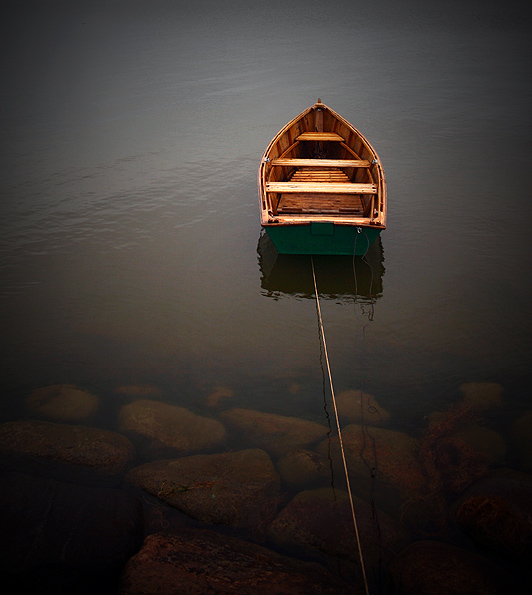 Nė neturiu žodžių pasakyt, kokie jausmai apima pažiūrėjus į nuotrauką:ramybė, šiluma, tačiau tas valties pririšimas kartu suteikia tokį sukaustymą. Labai žavingos spalvos ir pati mintis. Nuos-ta-biai. :]
