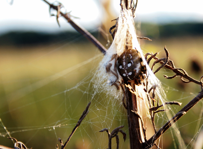 Kaip foto...net nežinau.Akys bėgioja po visą kadrą.Nėra pagrindinio akcento už kurio jos užkliūtų.Jei tai voras,tada jis pernelyg blankus ir pasimeta voratinklyje.....Baltas dangus per daug atitraukia dėmesį....voratinklis "perdegė" ir panašiai.Vorai labai nebaikštūs padarai (išskyrus krabvorius),galima juos "pasodinti" į patogią vietą ir fotografuoti įvairiomis pozomis :) Sėkmės sekančiuose pabandymuose...