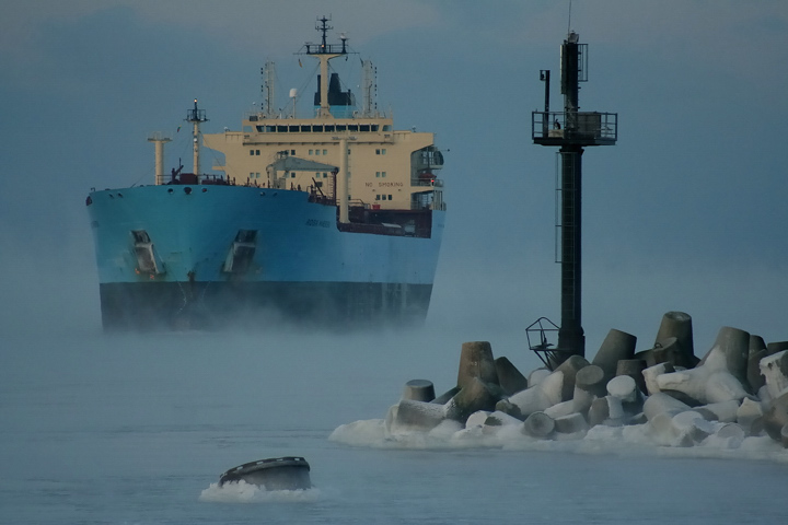 Erdvės trūksta, bet metalo, molo, rūko ir vandens jėga nuotraukoje nenuginčyjama